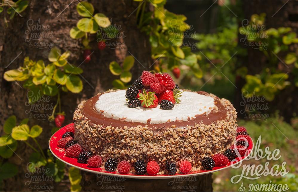 Coloque avelãs picadas em toda a volta do bolo. Coloque no topo do bolo um pouco de chantilly e espalhe, mas sem cobrir totalmente o chocolate, e por cima disponha alguns frutos vermelhos.